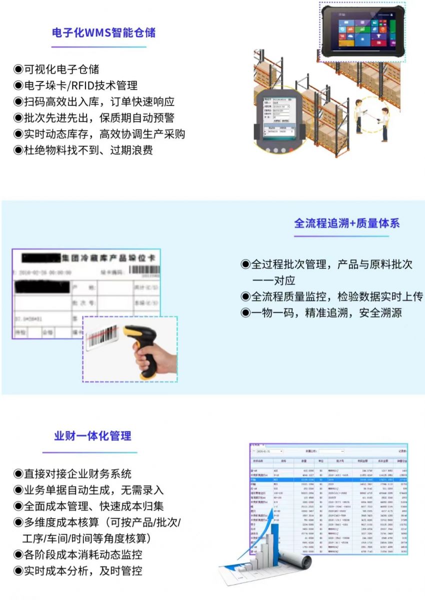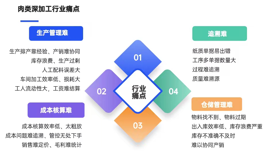 依托云存儲、物聯網、工業互聯網技術,對原料采購、初加工、深加工、冷鏈倉儲等全業務鏈進行信息化升級和改造,實現企業生產成本可控、生產流程責任可究、全程數據電子化、質量可追溯等核心價值,幫助企業提高整體市場競爭力,有效降本增效!